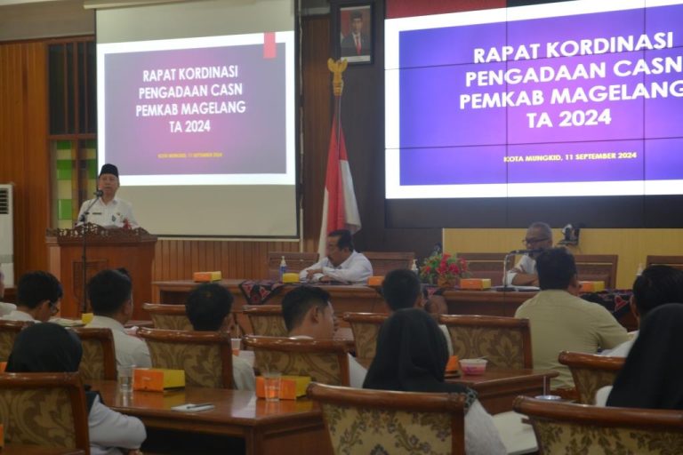 Hal itu disampaikan Kepala Bidang Pengadaan, Pemberhentian, dan Informasi Kepegawaian pada Badan Kepegawaian Pendidikan dan Pelatihan Daerah (BKPPD) Kabupaten Magelang, Agung Satria Utama, saat Rapat Koordinasi Seleksi Pengadaan Calon Aparatur Sipil Negara (CASN) Tahun 2024, di Ruang Bina Karya Komplek Setda Kabupaten Magelang, Rabu (11/9/2024).