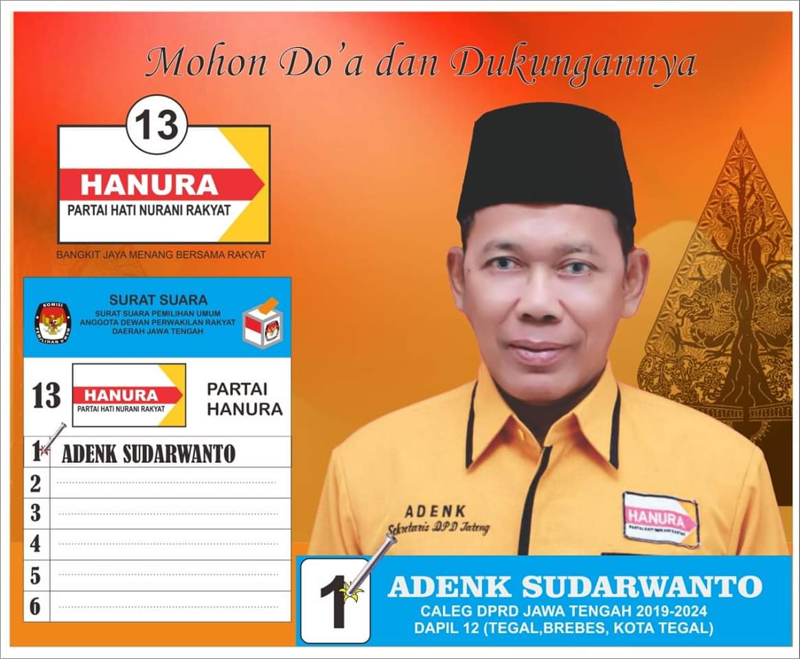 Adenk Sudarwanto yang kini menjabat sebagai Sekretaris DPD Partai Hanura Jawa Tengah ini mengaku optimis akan melenggang menjadi Anggota DPRD Provinsi Jawa Tengah periode 2019-2024. “Misi besar saya adalah berkarya untuk kebaikan bersama, untuk kemashalatan manusia dan lingkungan dengan landasan The right thing is doing and doing is the right thing,” ujar Adenk yang juga Pendiri FKPPI Jawa Tengah.