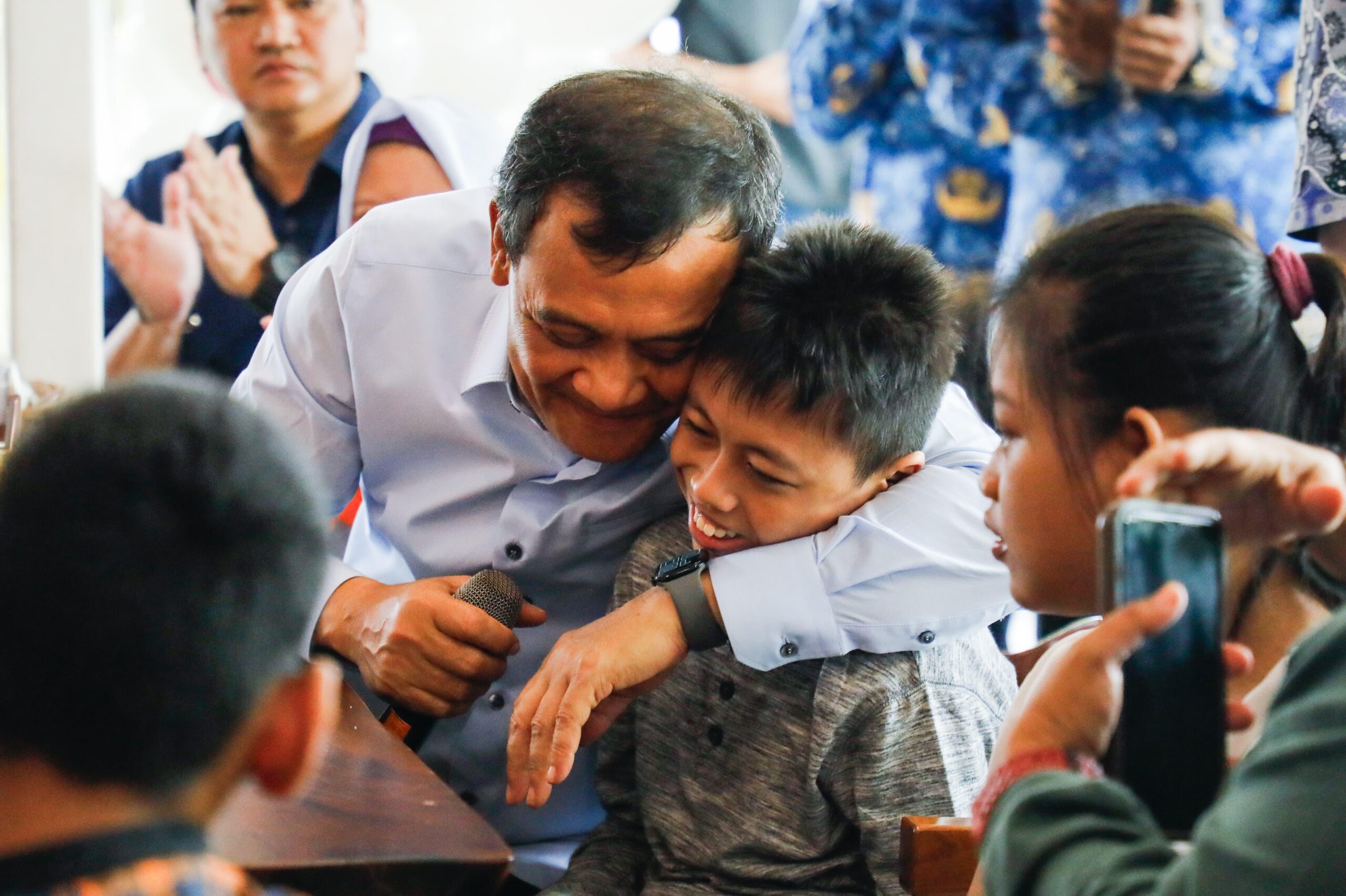 Gubernur terlihat haru bahkan beberapa kali memeluk, mencium dan mengelus kepala anak difabel yang duduk di samping kanan dan kirinya.