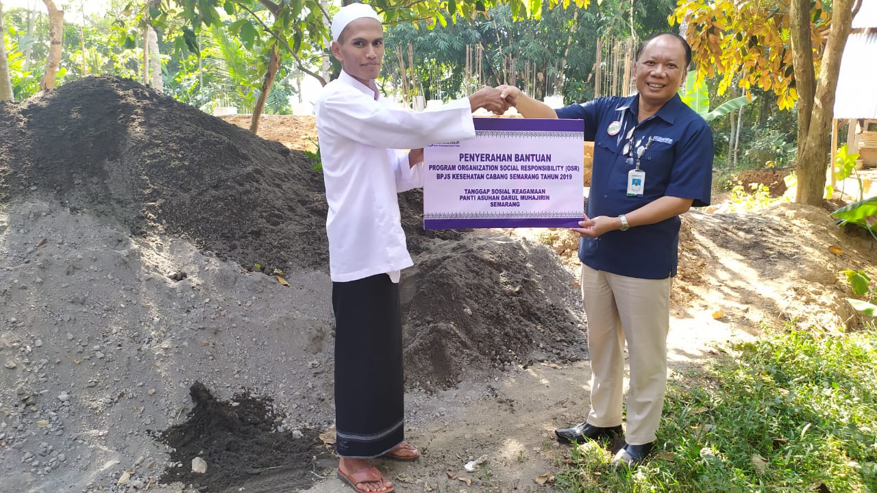 Penyaluran OSR itu secara simbolis diserahkan secara langsung oleh Kepala BPJS Kesehatan Cabang Semarang Agus Purwono. Bantuan OSR tersebut diterima oleh Pengasuh Panti Asuhan Darul muhajirin Gunungpati Semarang Saefulloh berupa bahan material bangunan semen, pasir dan besi sloof seperti diatas.