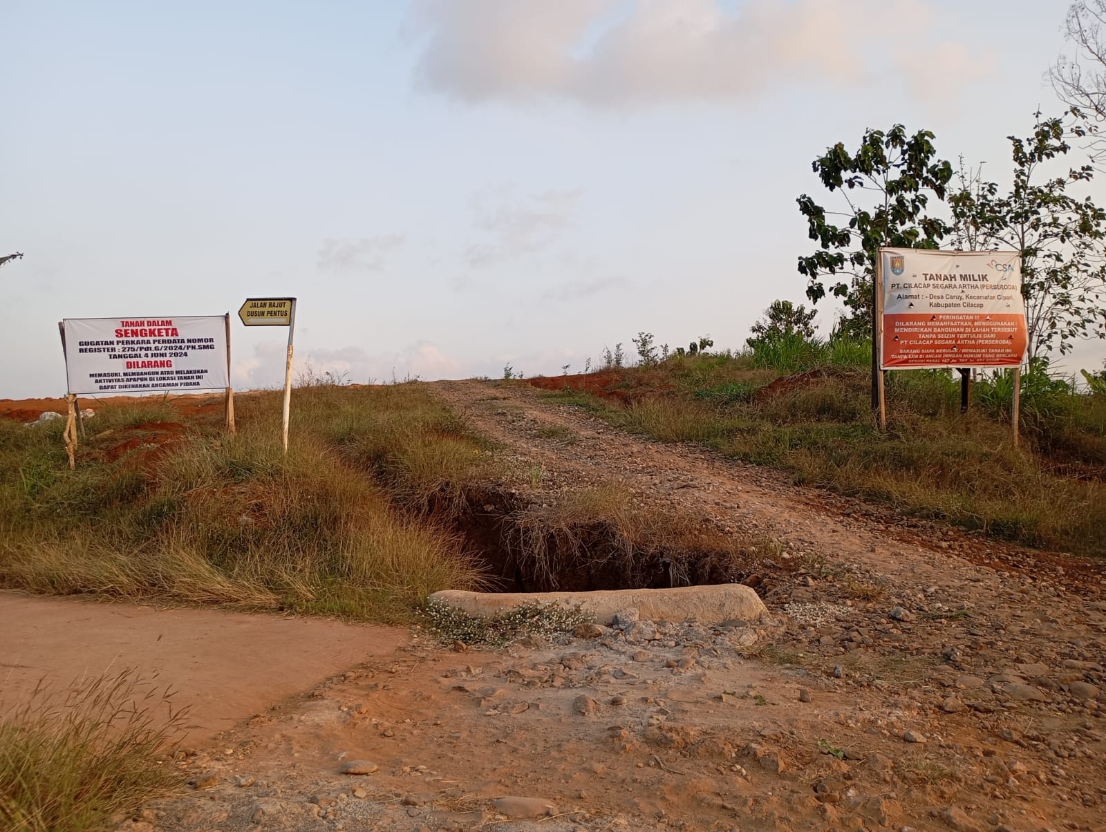 Kondisi demikian membuat tanah yang sudah dibeli tersebut dipasang papan bertuliskan ‘Tanah Dalam Sengketa’ dan Gugatan Perkara Perdatanya, sehingga selama masih sengketa dilahan tersebut dipasang papan tercantum larangan melakukan aktivitas apapun di lokasi tersebut dan dapat dikenakan ancaman pidana.