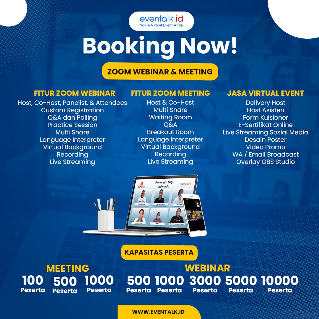 SEMARANG – Dalam rangka ulang tahun ketiga, eventalk.id menebar promo dan diskon menarik bagi para pelanggan setianya. Eventalk merupakan penyedia layanan kebutuhan pelanggan pada bidang teknologi meliputi event virtual, streaming, operator zoom, hingga operator webinar.