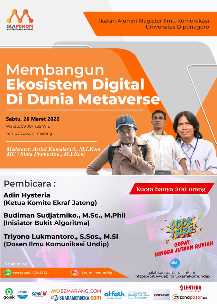 SEMARANG –  Ikatan Alumni Magister Ilmu Komunikasi Universitas Diponegoro (Ika Mikom Undip) mengadakan webinar bertajuk “Membangun Ekosistem Digital di Dunia Metaverse” pada Sabtu (26/3) besok mulai pukul 09.00 hingga 11.35 WIB melalui aplikasi zoom meeting.