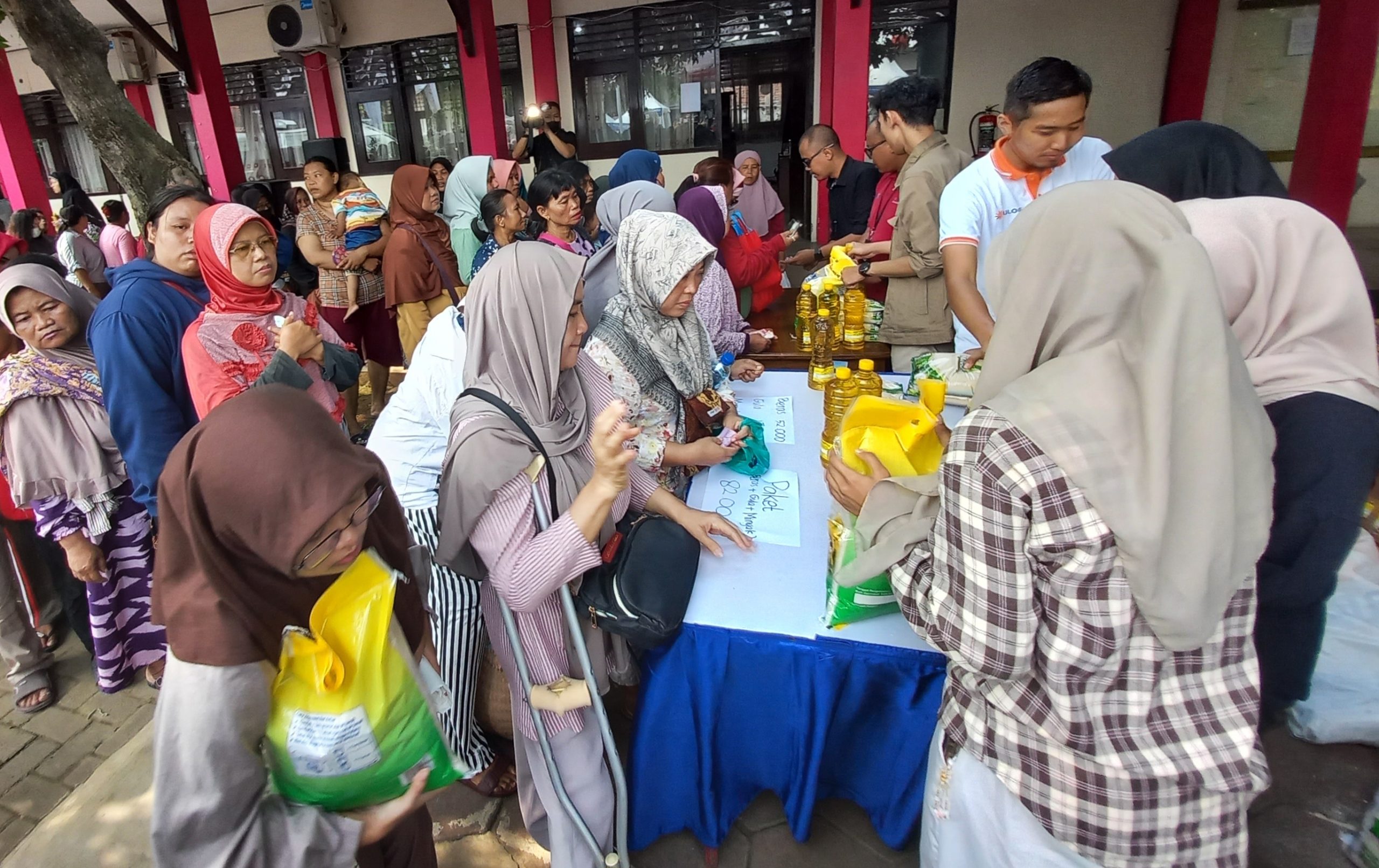 Banyak warga yang rela antre demi mendapatkan beras, cabai, bawang, minyak goreng, gula dan lainnya yang berlangsung di halaman Kantor Kecamatan Gayamsari, Kota Semarang, Jumat 8 Maret 2024.