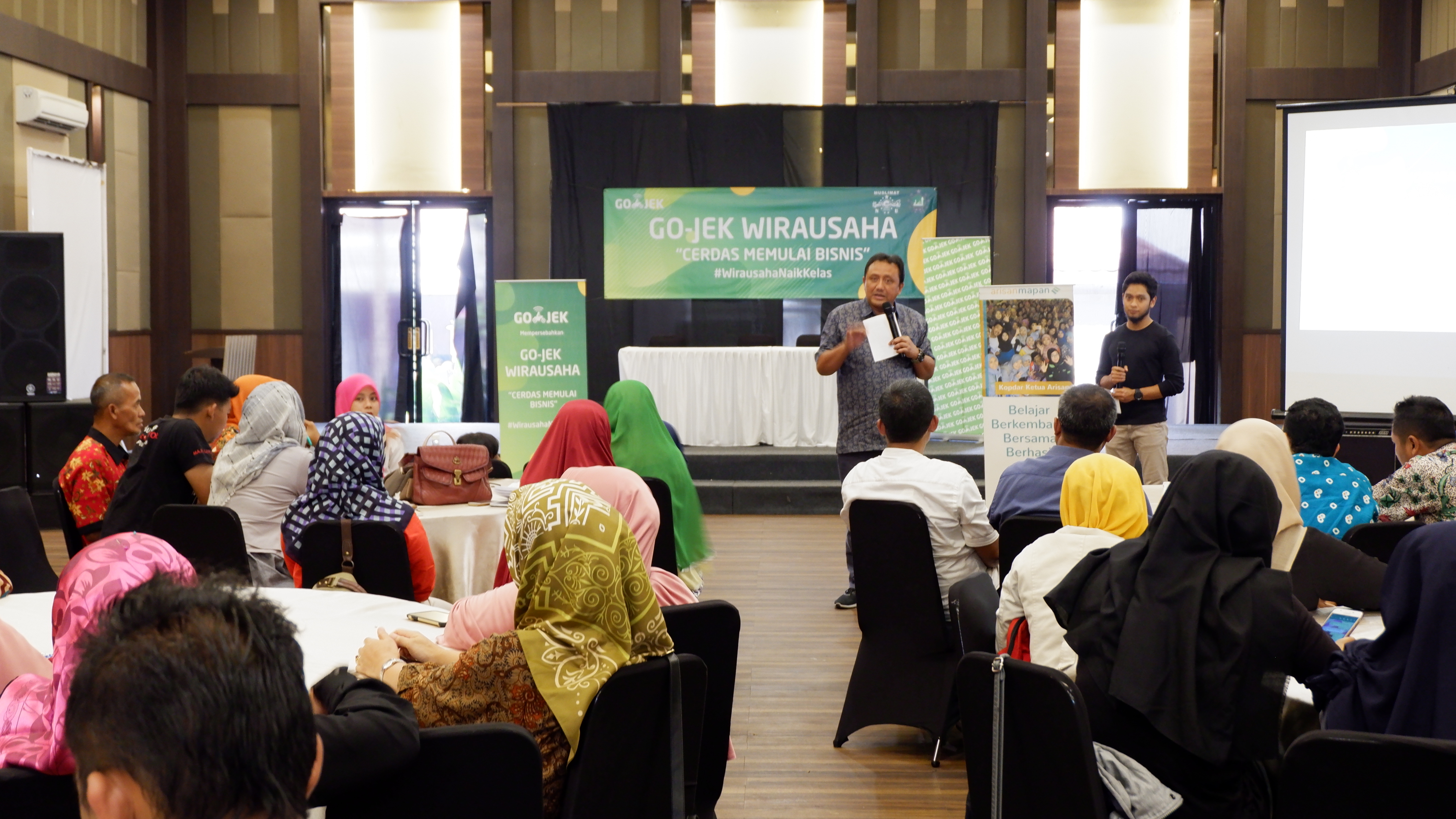 PURWOKERTO- GO-JEK, penyedia layanan on-demand berbasis teknologi terdepan di Indonesia, hari ini mengadakan kegiatan GO-JEK Wirausaha, bertempat di Oemah Daun Cafe & Resto, Purwokerto. Kegiatan yang diselenggarakan bersama Pengurus Pusat Muslimat Nahdlatul Ulama (Muslimat NU) dan Forum Corporate Social Responsibility (CSR) Satria Banyumas bertujuan membantu para pengusaha mikro, kecil dan menengah (UMKM) di Purwokerto supaya bisa meningkatkan skala bisnisnya usaha dan memperluas pasar mereka melalui teknologi. Kegiatan ini dihadiri oleh lebih dari 200 pengusaha UMKM, dan dibuka oleh Bupati Banyumas – Kanjeng Pangeran Haryo Adipati Purbowinoto Ir. H. Achmad Husein.