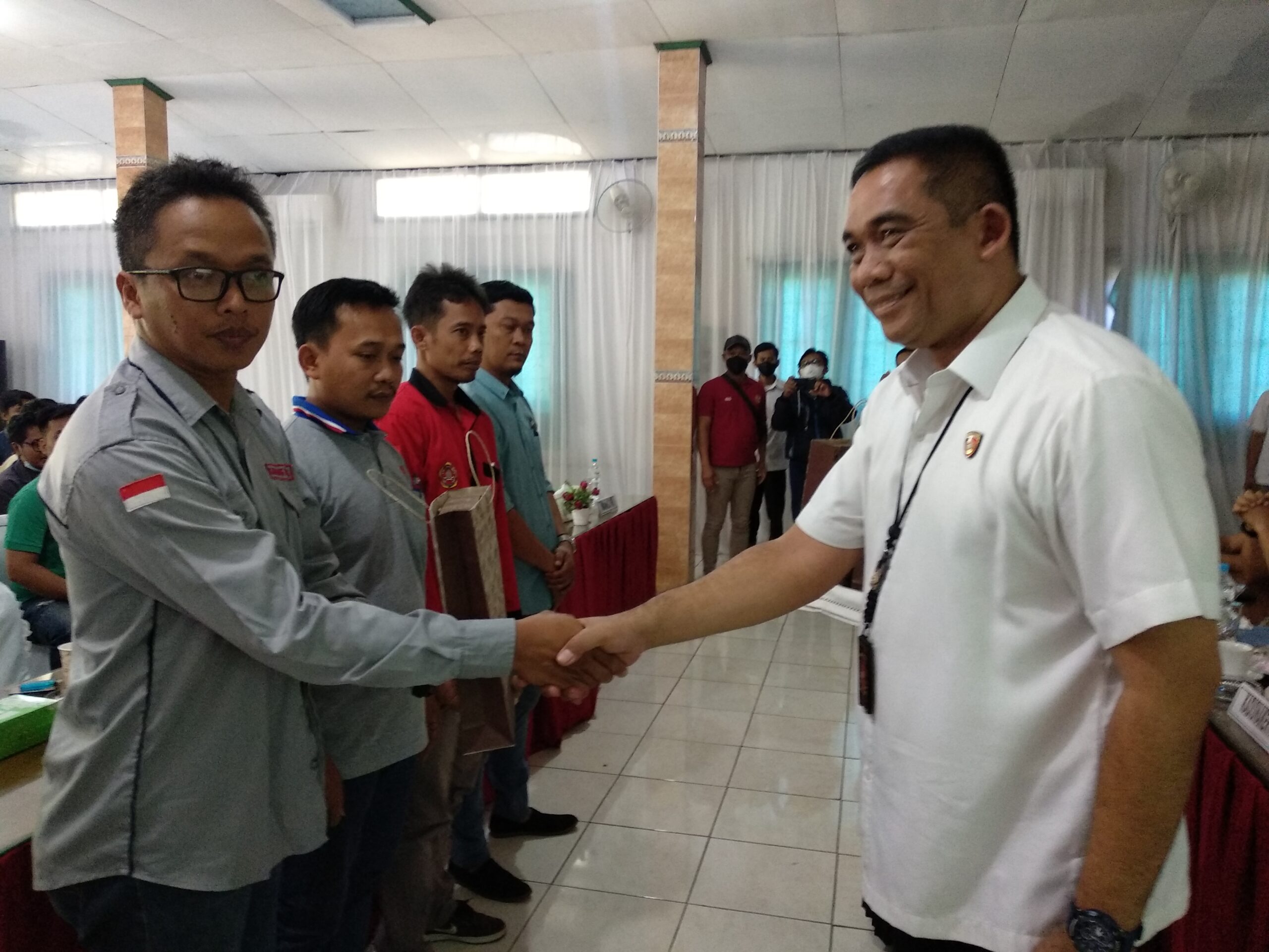 Kasubdit 2 Ditintelkam Polda Jateng AKBP Harun Hurdana, SH, MM saat memberikan kenang-kenangan kepada peserta dari kelompok pemuda di sekitar Kawasan Industri Terpadu Batang. (alkomari)