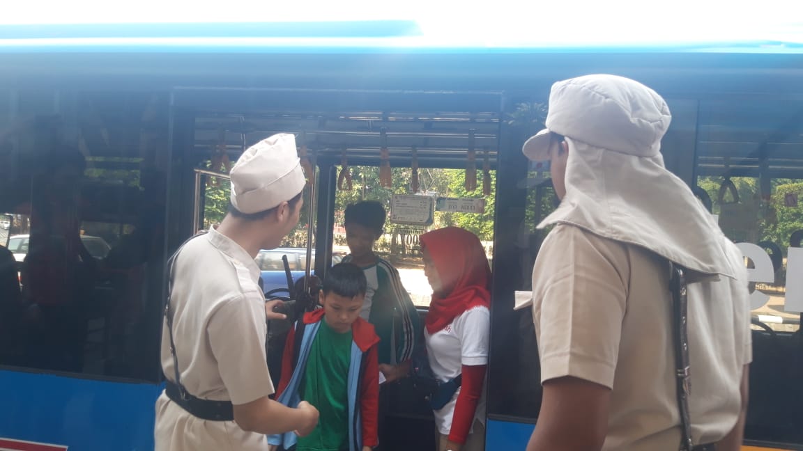 Tidak hanya karyawan yang berada di kantor, karyawan yang bertugas di setiap armada dan halte juga ikut melayani para pengguna jasa dengan mengenakan kostum perjuangan.