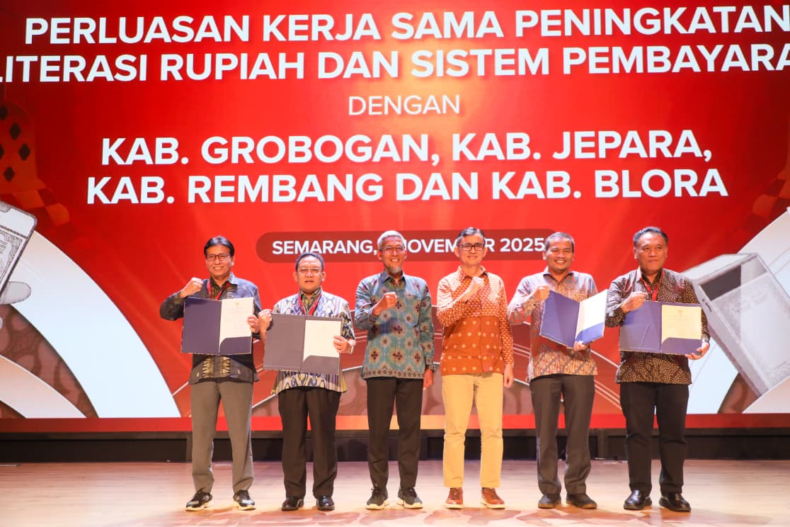 Pada kesempatan tersebut, dilaksankaan simbolisasi penyerahan nota kesepakatan penggunaan QRIS dengan empat kabupaten, yaitu Grobogan, Rembang, Jepara, dan Blora.*