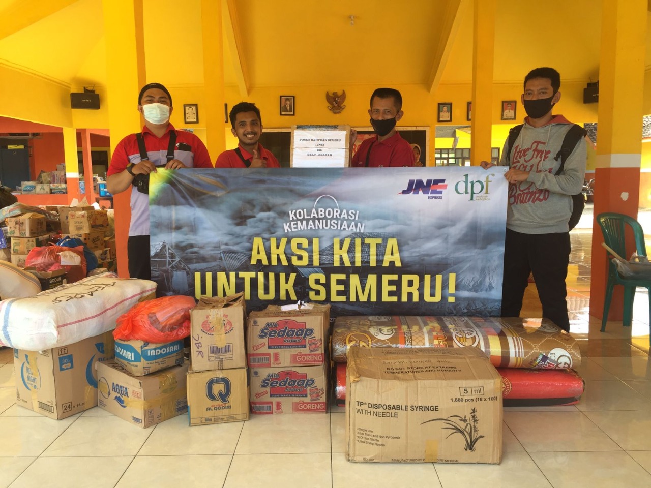Selain tim JNE juga bekerjasama dengan jaringan Gusdurian untuk menyalurkan bantuan berupa obat-obatan, sembako, tikar, selimut, makanan siap saji dan diapers yang langsung dibagikan untuk warga terdampak erupsi.