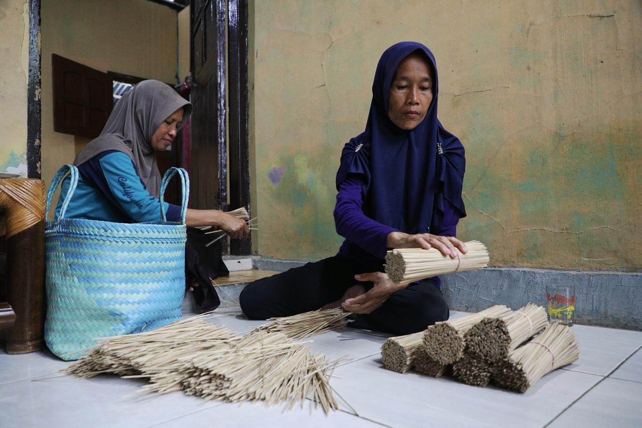 Kelompok Usaha Bersama (Kube) Mandiri Sejahtera yang terdiri dari sepuluh emak-emak terlihat bersemangat memproduksi tusuk sate berbahan bambu.