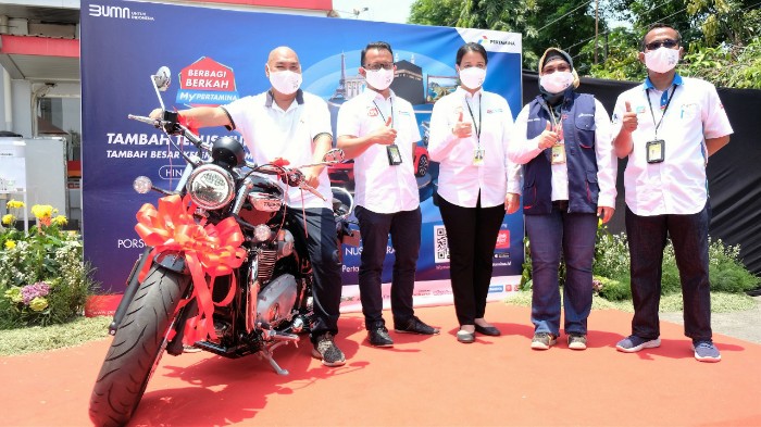 SEMARANG – Setelah melewati tujuh periode pengundian program Berbagi Berkah MyPertamina, salah satu hadiah utama berupa sepeda motor Triumph Bonneville Speedmaster dimenangkan oleh pelanggan yang beruntung asal kota Semarang bernama Jonny Sugianto. Hadiah tersebut secara resmi diserahkan oleh Executive General Manager Pertamina Pemasaran Regional Jawa Bagian Tengah, Sylvia Grave Yuvenna, di SPBU Ahmad Yani pada Rabu (3/3).