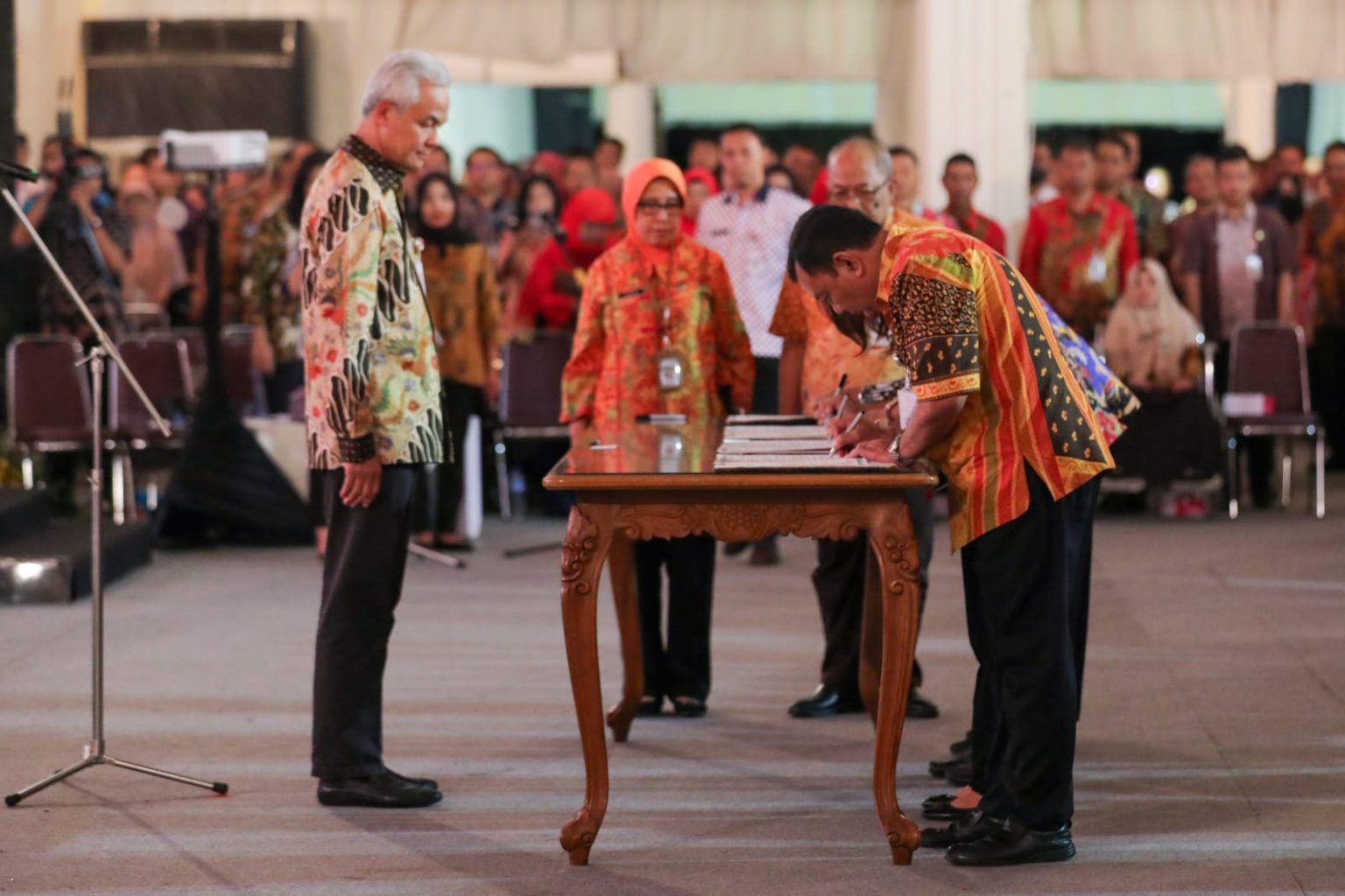 SEMARANG – Gubernur Jawa Tengah Ganjar Pranowo melantik dan mengambil sumpah/janji jabatan 297 orang pejabat pimpinan tinggi pratama, pejabat administrator, dan pejabat pengawas, di lingkungan Pemerintah Provinsi Jawa Tengah. Pelantikan dilakukan di Gedung Pusat Rekreasi dan Promosi Pembangunan (PRPP) Semarang, Jumat (1/9/2023) malam.