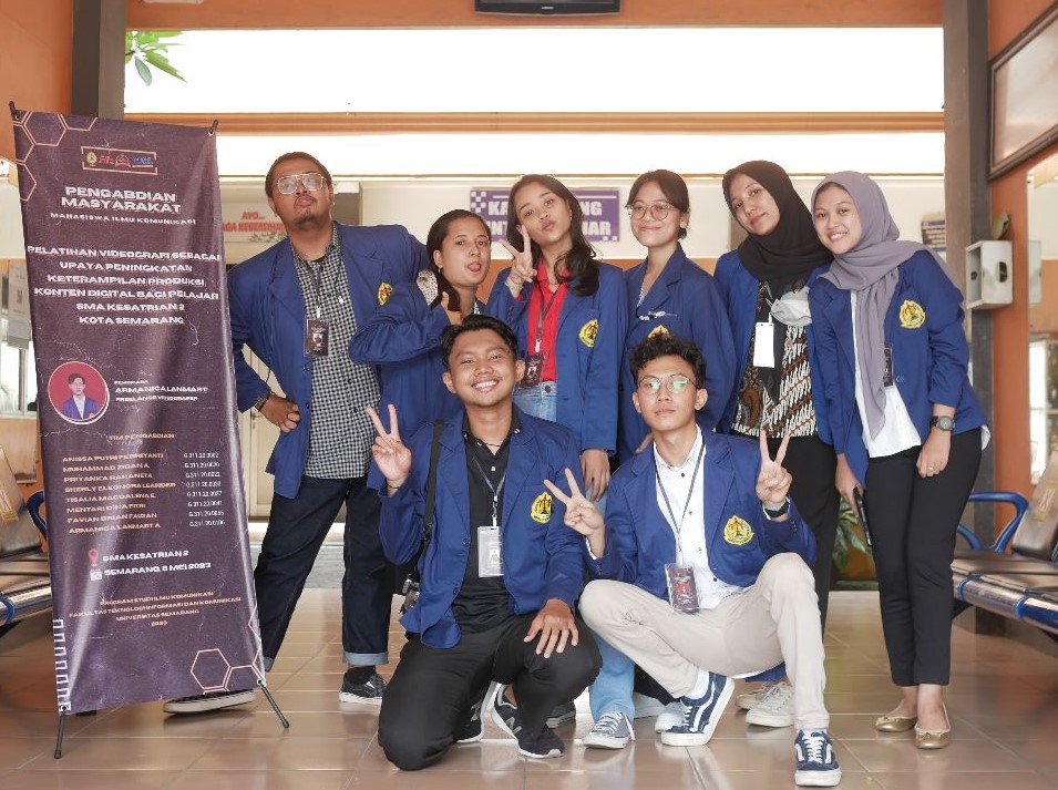 Mahasiswa Ilkom USM berfoto bersama disela pelatihan videografi di SMK Kesatrian 2 Semarang. (foto:ist)