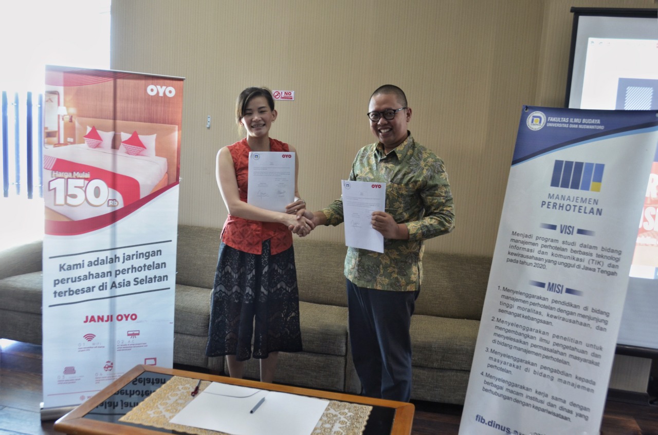 SEMARANG – Di era industri 4.0 mahasiswa dituntut untuk mengerjakan segala sesuatu secara digital dengan memanfaatkan teknologi modern. Demi mewujudkan hal tersebut, aplikasi OYO bekerja sama dengan Manajemen Perhotelan (Manahot) Universitas Dian Nuswantoro (Udinus) dan menandatangani MoU pada Jumat, 14 Januari 2020.