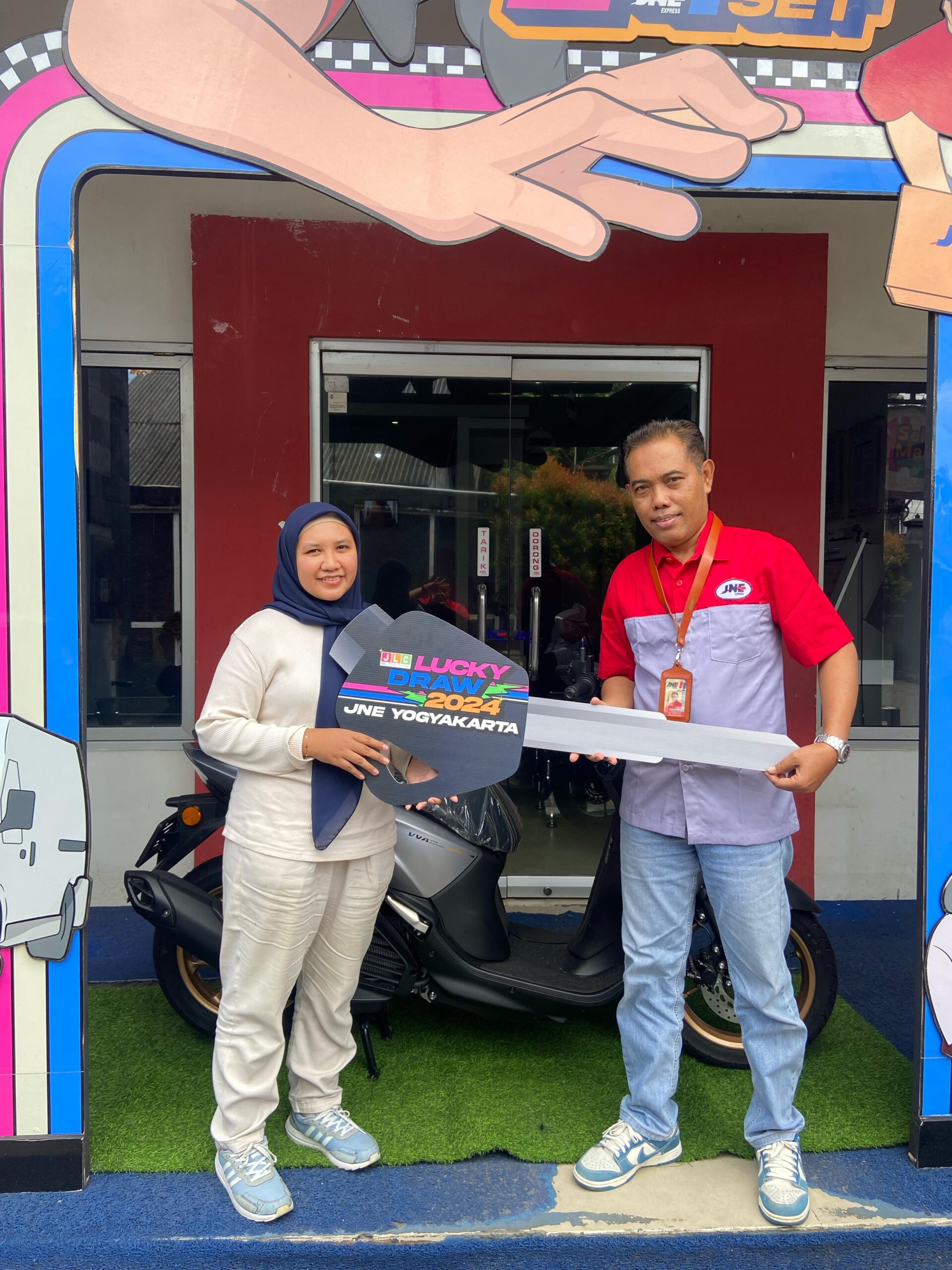 Hadiah utama JLC Lucky Draw 2024 berupa sepeda motor diserahkan secara langsung kepada Emas Dwi Atika Floreanti di kantor JNE Yogyakarta, Jl.Sorogenen 196 Nitikan Umbulharjo Yogyakarta oleh Kepala Cabang Utama JNE Yogyakarta Adi Subagyo.