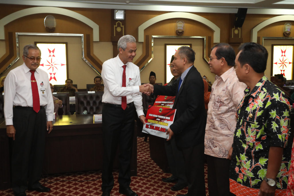 Dalam kesempatan tersebut, gubernur menyerahkan bantuan sosial dan hibah kepada sembilan perwakilan dari berbagai bidang. Di antaranya hibah bidang pendidikan keagamaan, yaitu pembangunan gedung MA Hidayatul Mubtadi’in di Sayung, Demak, bidang pendidikan umum diantaranya menyangkut KKN tematik diserahkan kepada Universitas Semarang.