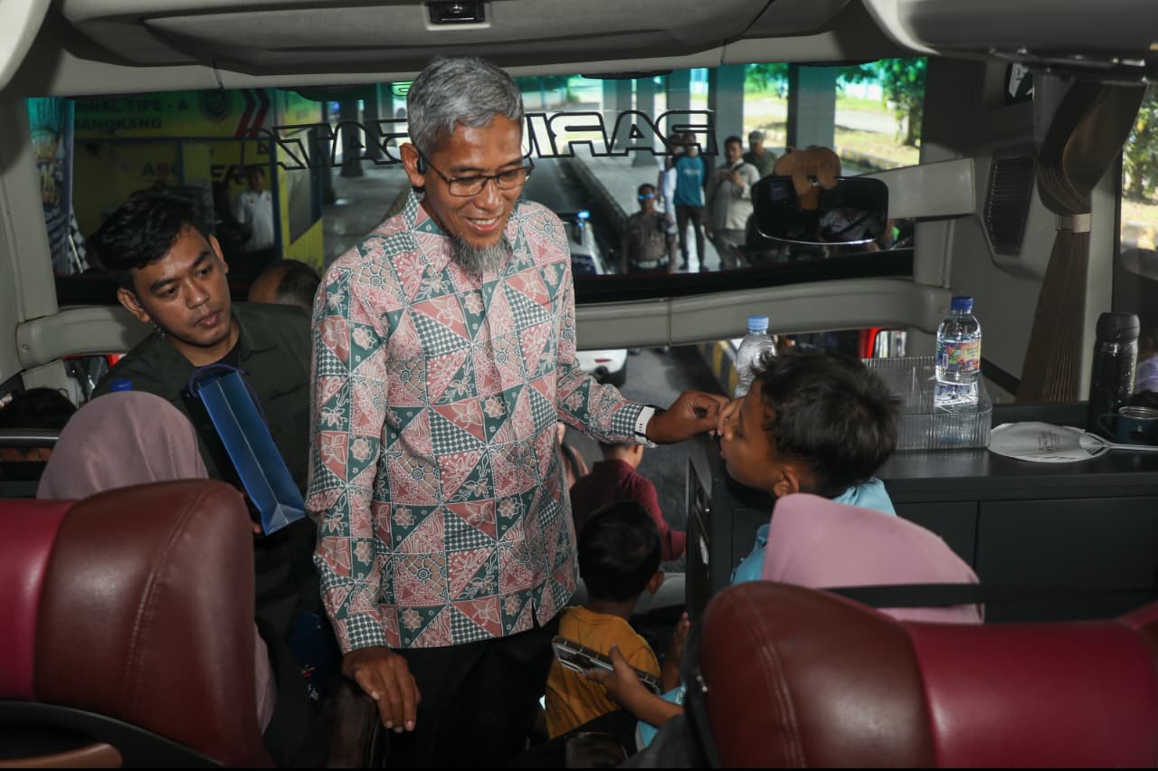 Sumarno juga melakukan flag off serta menyapa pemudik di atas bus. Dia memberikan semangat kepada para pemudik agar bekerja dengan baik untuk mendapatkan rejeki yang halal dan berkah bagi keluarganya.