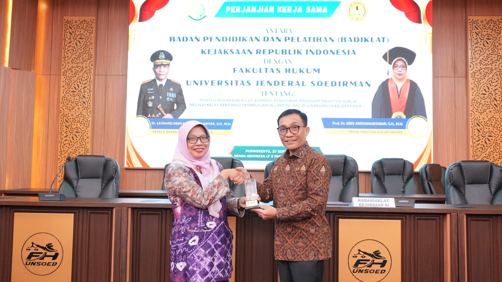 PURWOKERTO – Badan Pendidikan dan Pelatihan (Badan Diklat) Kejaksaan Republik Indonesia resmi menjalin kerja sama dengan Fakultas Hukum Universitas Jenderal Soedirman (FH Unsoed) dalam penyelenggaraan kelas afirmasi pendidikan program Magister Hukum melalui jalur Rekognisi Pembelajaran Lampau (RPL) di lingkungan Kejaksaan RI.