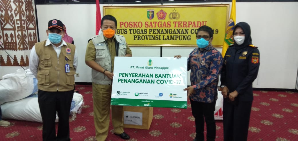 JAKARTA- Manajemen PT Great Giant Pineapple memberikan bantuan alat pelindung diri (APD) kepada Pemerintah Provinsi Lampung sebanyak 131.000 pcs. Donasi diserahkan pada Senin 11 Mei 2020 di Balai Keratun Bandar Lampung.
