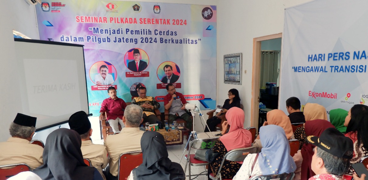 Demikian benang merah yang terungkap dalam Seminar Pilkada Serentak 2024 bertajuk ”Menjadi Pemilih Cerdas dalam Pilgub Jateng 2024 Berkualitas” di Gedung Pers Jateng, Jalan Tri Lomba Juang No 10 Semarang, Kamis 31 Oktober 2024.
