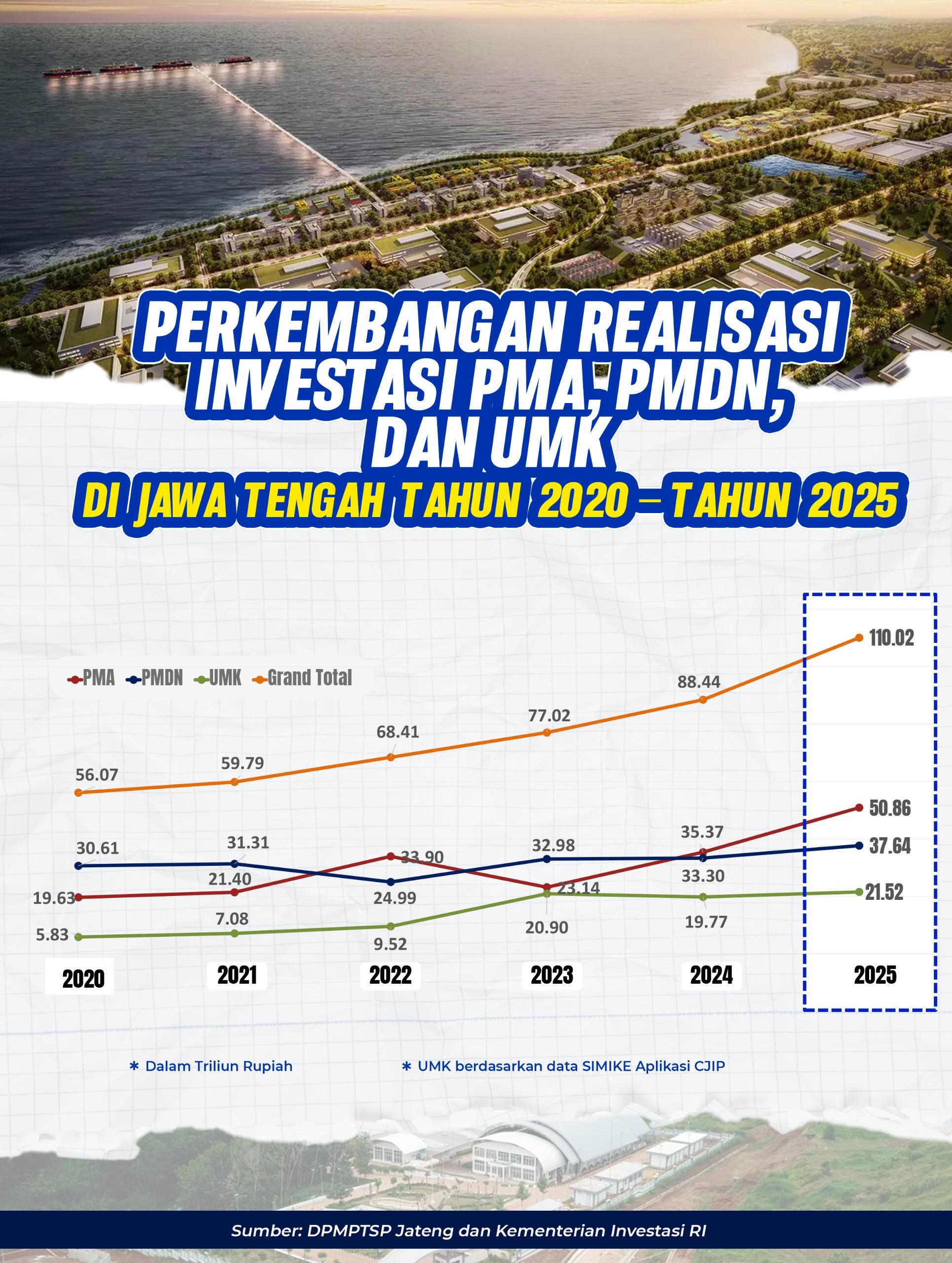 Sakina menambahkan, realisasi investasi sektor Usaha Kecil dan Mikro (UMK) di Jawa Tengah pada 2025 mencapai Rp 22,143 triliun. Nilai tersebut terdiri atas investasi Usaha Kecil sebesar Rp 7,929 triliun dan Usaha Mikro Rp 14,214 triliun.
