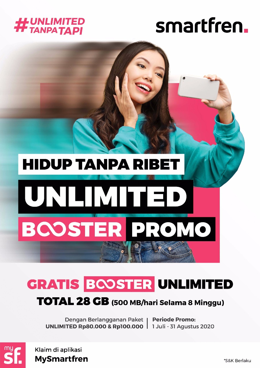 Manfaat tambahan Booster Unlimited hanya berlaku untuk pelanggan yang melakukan aktivasi atau pembelian paket Unlimited Rp80.000 (batas pemakaian wajar 1 GB) dan Rp100.000 (batas pemakaian wajar 1,5 GB), pada periode 1 Juli 2020 sampai dengan 31 Agustus 2020. Adapun free Booster Unlimited Rp10.000 atau Smart Ngobrol Rp10.000 bisa didapatkan melalui aplikasi MySmartfren setiap 7 hari sekali dengan batas maksimal 4x dalam sebulan. Klaim promo tersebut harus dilakukan melalui aplikasi MySmartfren.