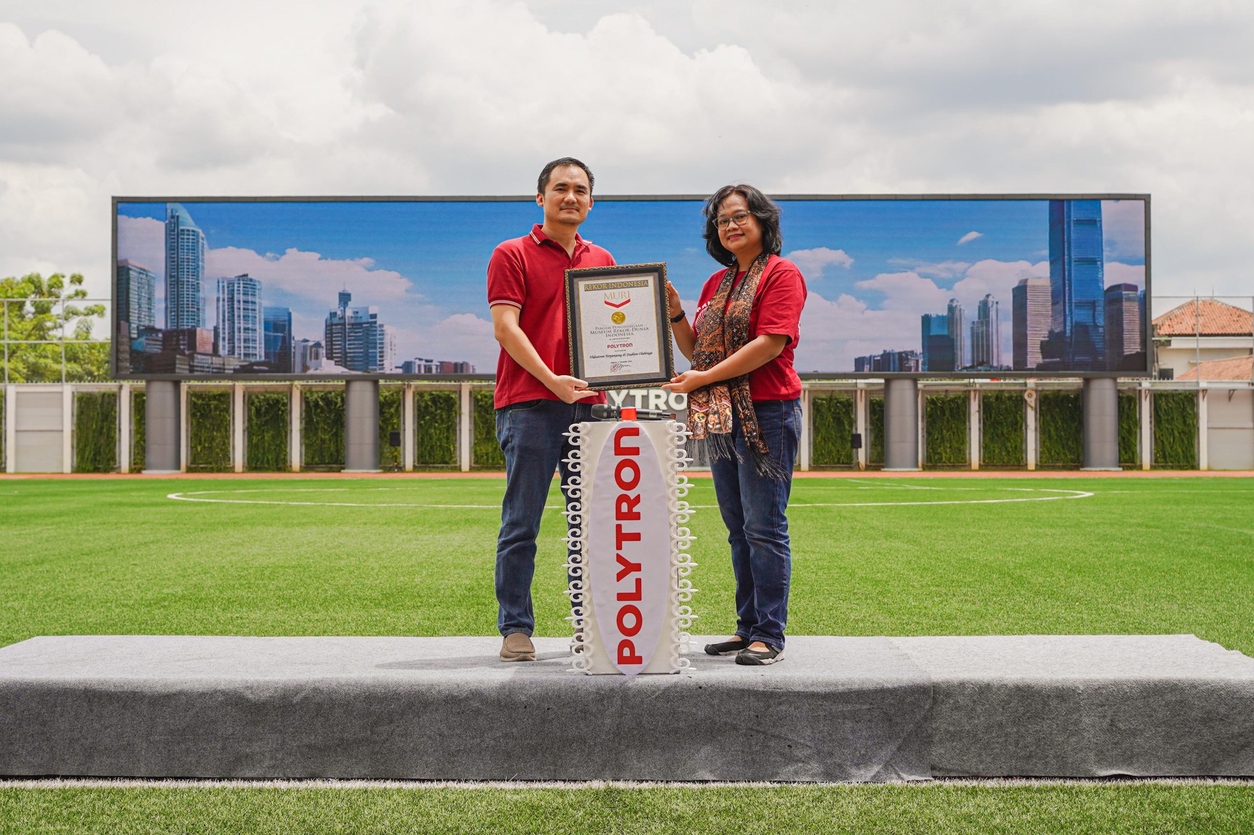 “Ketua umum MURI Bapak Jaya Suprana, menyampaikan bahwa dibalik setiap rekor MURI tersirat kisah perjuangan manusia menciptakan karsa dan karya terbaik dibidang kemampuan masing-masing. Kami sampaikan bahwa karsa dan karya, yang diprakarsai oleh PT Hartono Istana Teknologi (POLYTRON) dengan produknya POLYTRON Videotron Outdoor Pitch 10.0 yaitu Videotron Terpanjang di Stadion Olahraga, sepanjang 46 meter resmi tercatat di Museum Rekor Dunia Indonesia,” ujarnya.